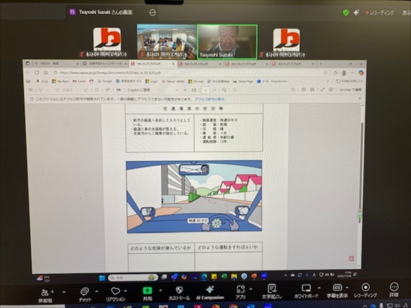 自動車事故対策機構(NASVA)の「ヒヤリ・ハット事例集」を活用し、実際の運転状況を再現した演習を通して、日常の運転に潜む危険を察知し、安全運転への意識と対応力を向上させました。