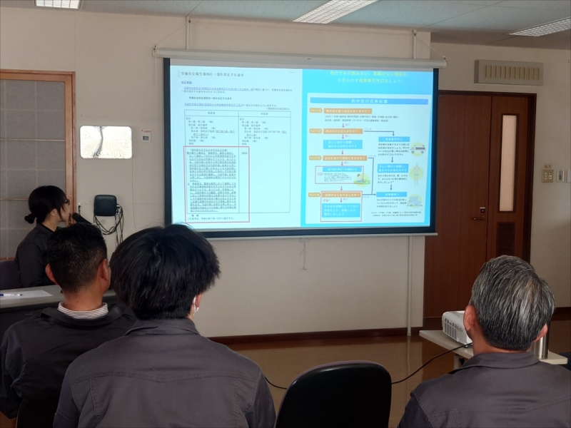 現場での事故防止についてや、これからの時期に欠かせない熱中症対策、そして「社内安全運転十か条」について改めてみんなで勉強しました。